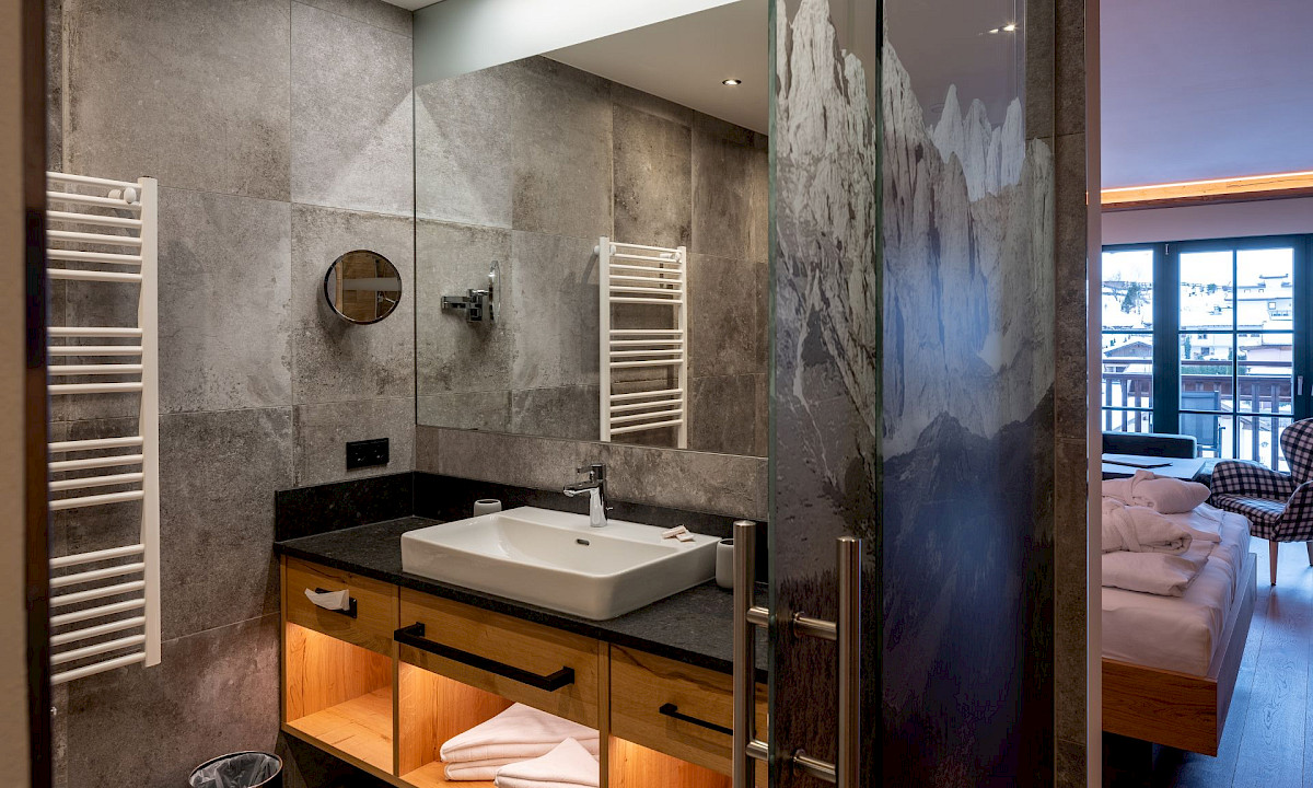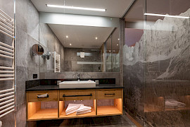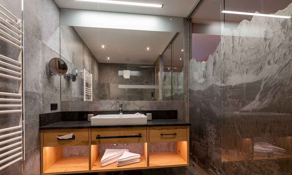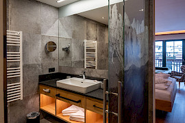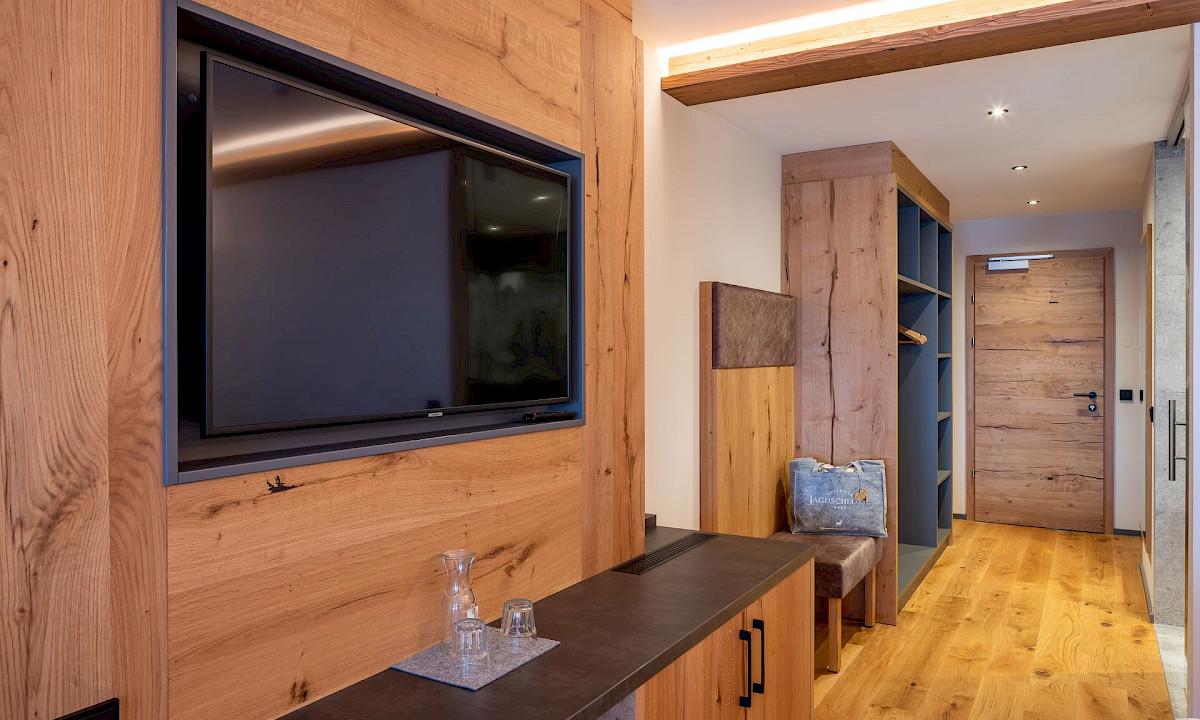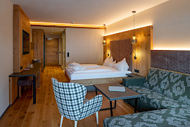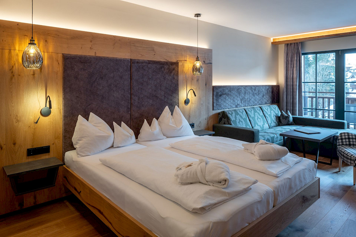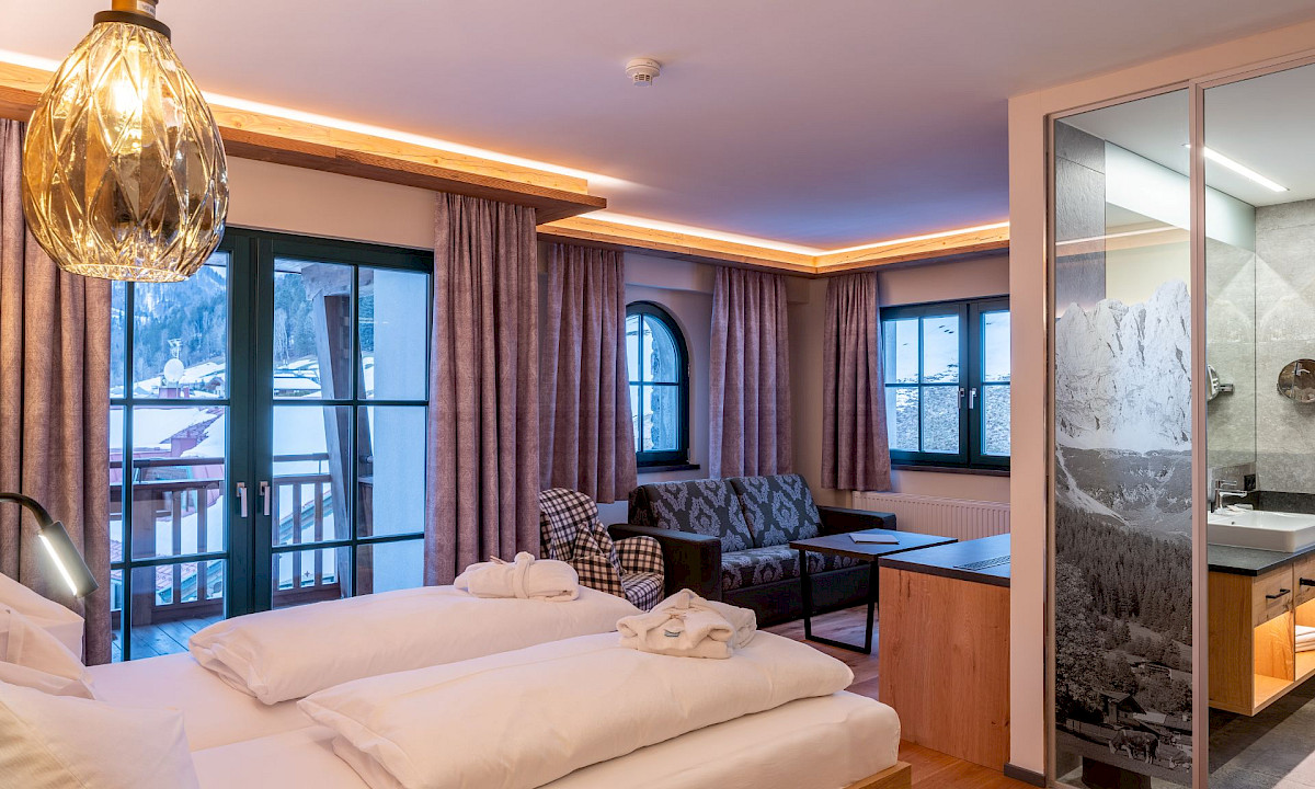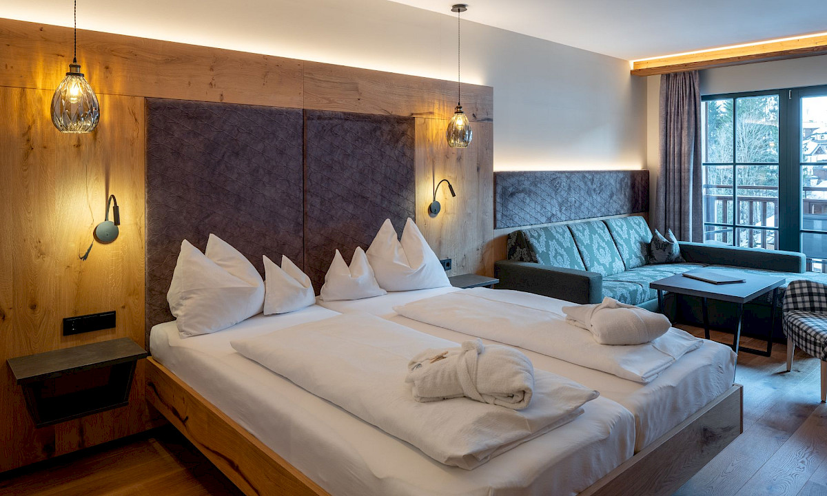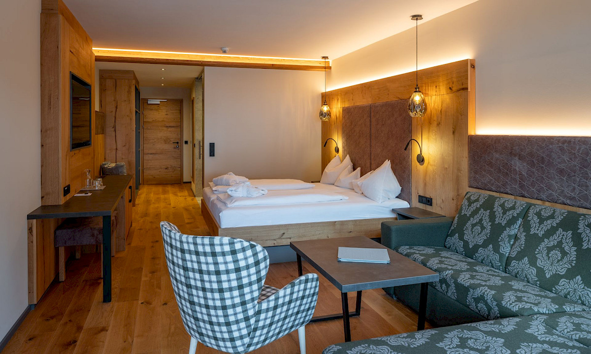 Doppelzimmer Kaiserpanorama Superior mit 40 m² und Südbalkon für einen freien Blick auf den Wilden Kaiser.