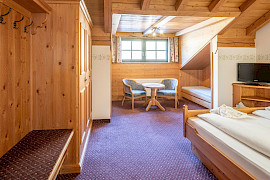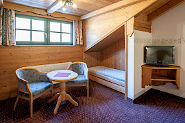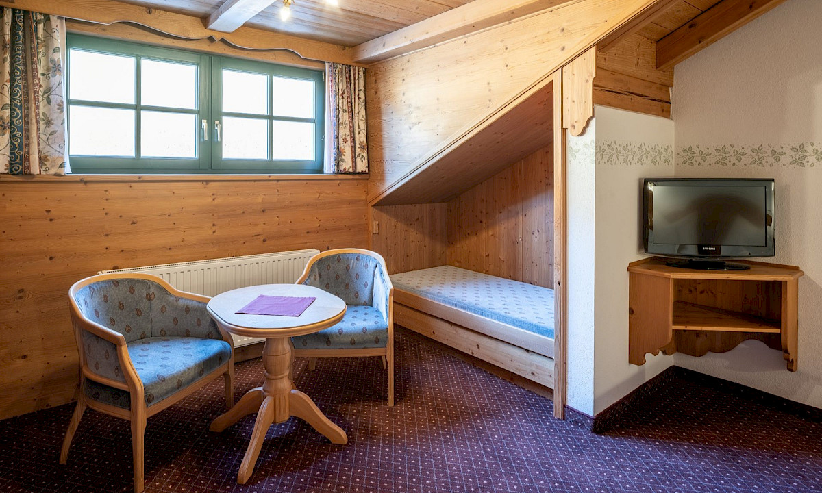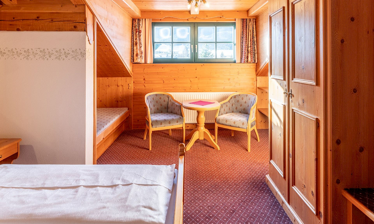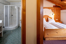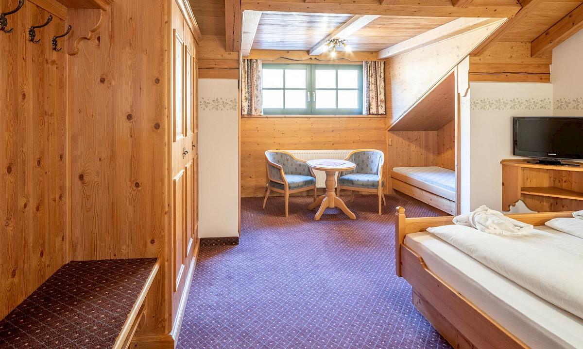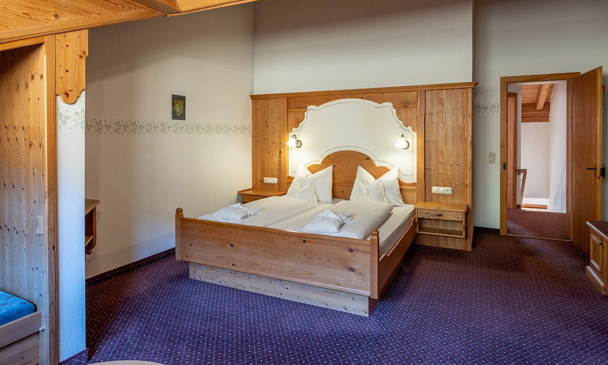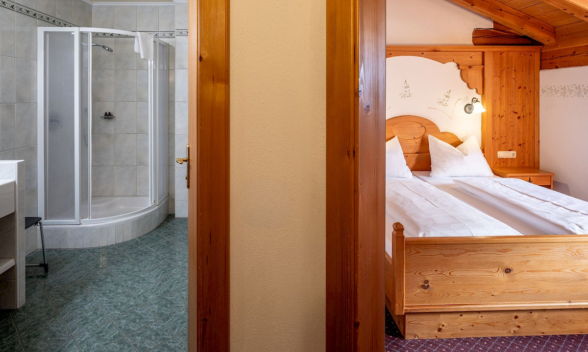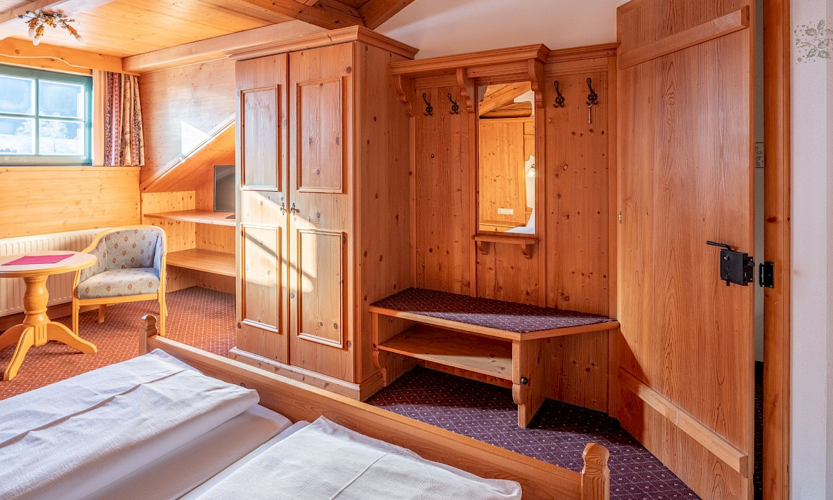 Das großzügige Doppelzimmer im Ansitz mit 30 m² befindet sich im Dachgeschoss und begeistert mit Raum und Flair.