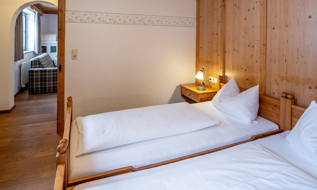 Das großzügige Studio im Turm des Jagdschlössls mit zwei getrennten Schlafzimmern und traditioneller Turm-Wohnstube.